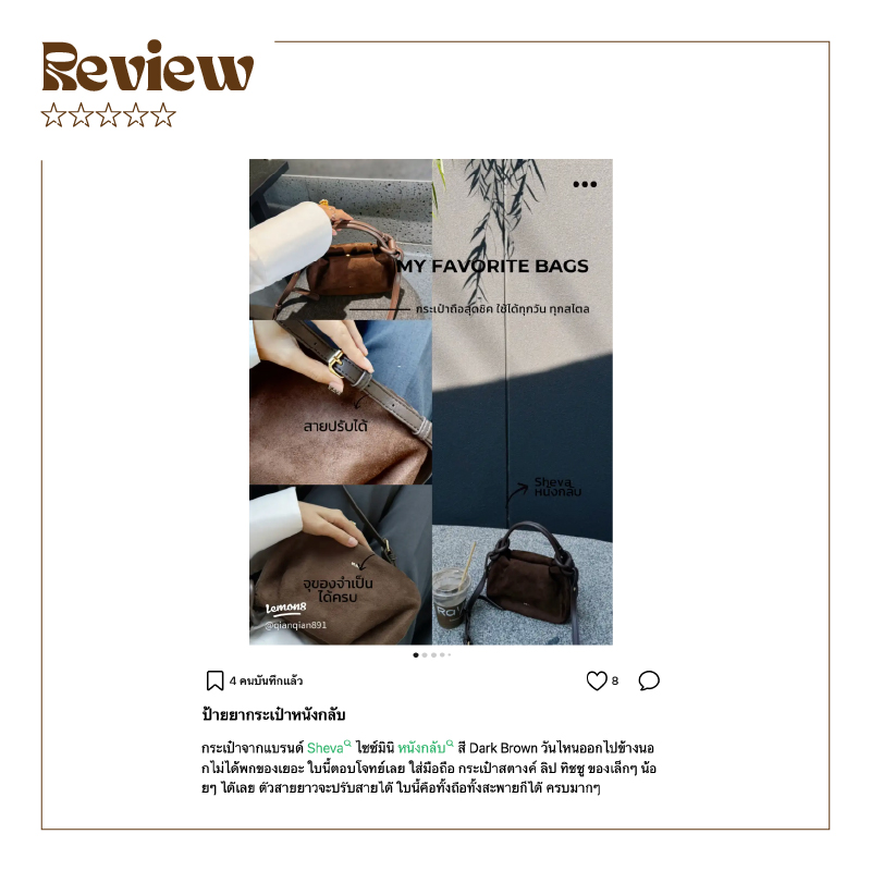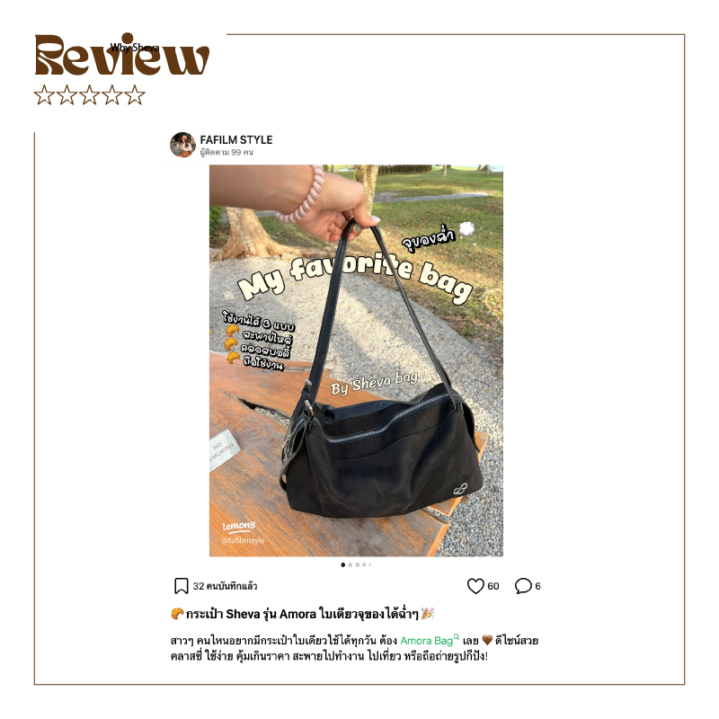 ทุกวันของชีวิต มีหลายบทบาท วันทำงาน วันสบาย ๆ วันนัดสำคัญ หรือวันที่อยากดูดีขึ้นอีกนิดเราเชื่อว่า “การแต่งตัวทุกวัน” ไม่ควรเป็นเรื่องยุ่งยาก แค่มีไอเท็มที่ใช่ ลุคทั้งวันก็มีชิวิตชีวาขึ้นได้ทันที Sheva ออกแบบมาเพื่อเป็น Daily Styling Companion กระเป๋าที่หยิบใช้ง่าย เข้าได้กับทุกลุค และอยู่ได้ทุกช่วงเวลา ดีไซน์เรียบง่ายแต่ดูดี ฟังก์ชันที่ใช้ได้จริง สไตล์ที่ทำให้คุณมั่นใจขึ้นทุกวัน ไม่ว่าลุคไหนในชีวิต เราอยากให้คุณคิดถึง Sheva เสมอ